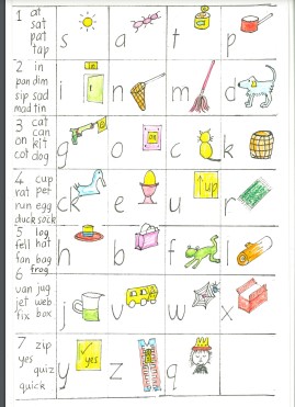 Students can practice blending and segmenting phonemes if the tutor shows them how to do it, such as with the illustrations below, where the child has to point to the picture that starts with /k/ (cat), and so on. Another activity is if the adult points to three pictures and the child blends the beginning sounds together e.g., a-ant and t-tin make /at/. OR, the tutor can point to 2-3 pictures that make a word, e.g., m-mop, a-ant, t-tin. The child figures it out, = /mat/. Another activity is “odd one out”, e.g., the child has to decide, “Which picture does not match – cat, hat, mop (answer is mop).